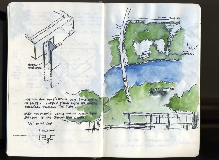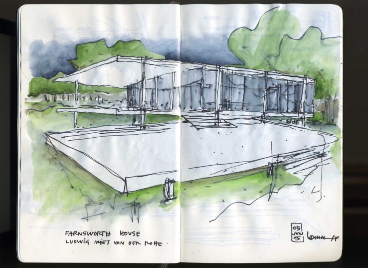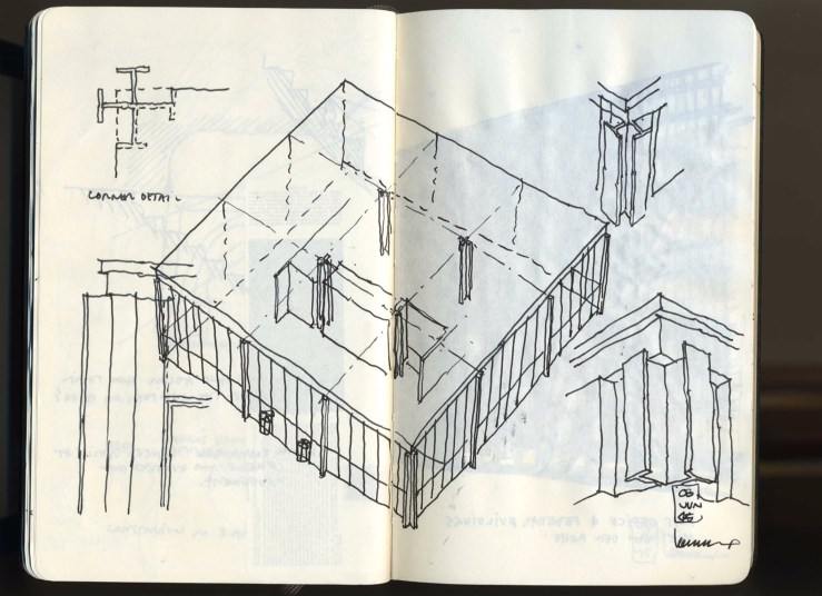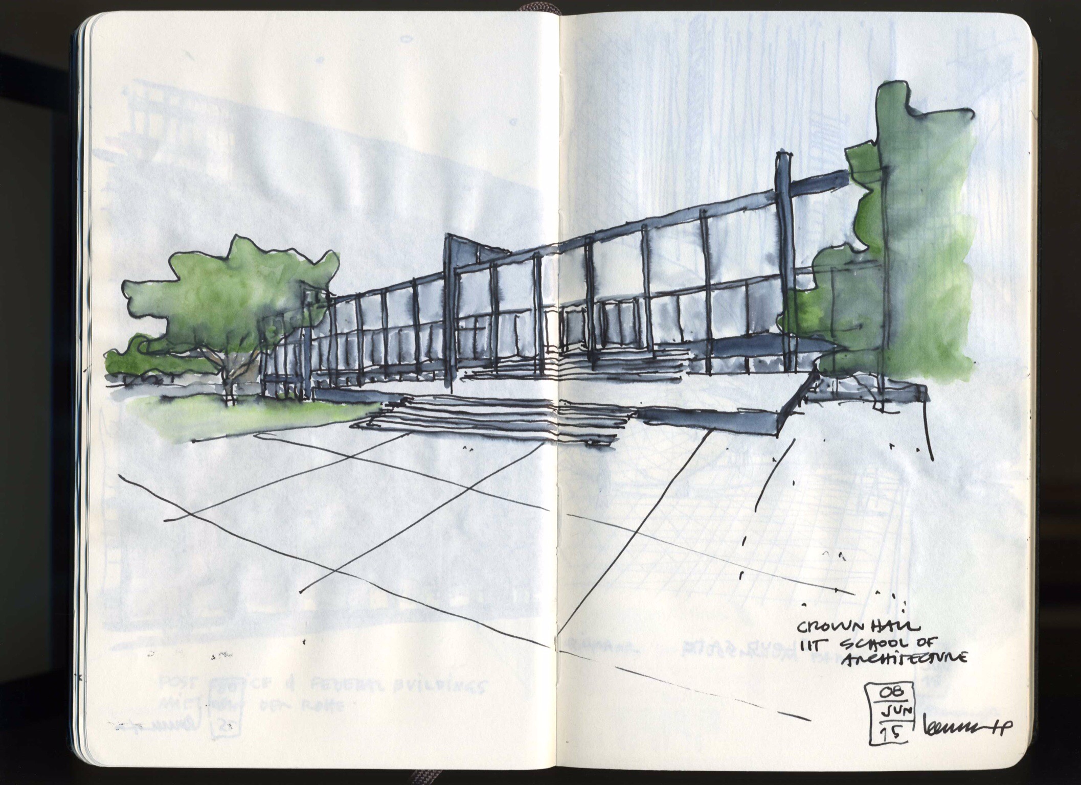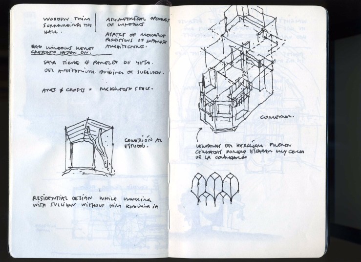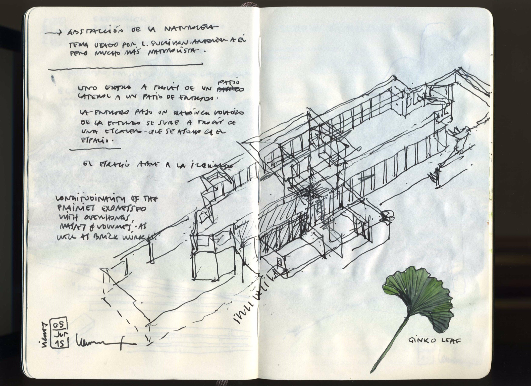 Therefore, as illustrated, a telephone cabin, a fountain and a “glorieta”, along with the mass of trees — all composed to acknowledge and reinforce — the City Hall’s main axis, perpendicular to the plaza. The mass of trees further recognize the building’s protruding arcades and the towers that flank them. (See sketch below, illustrating this space back in 2002).