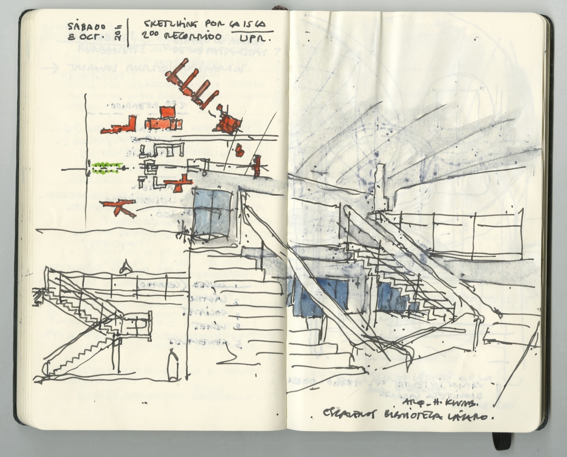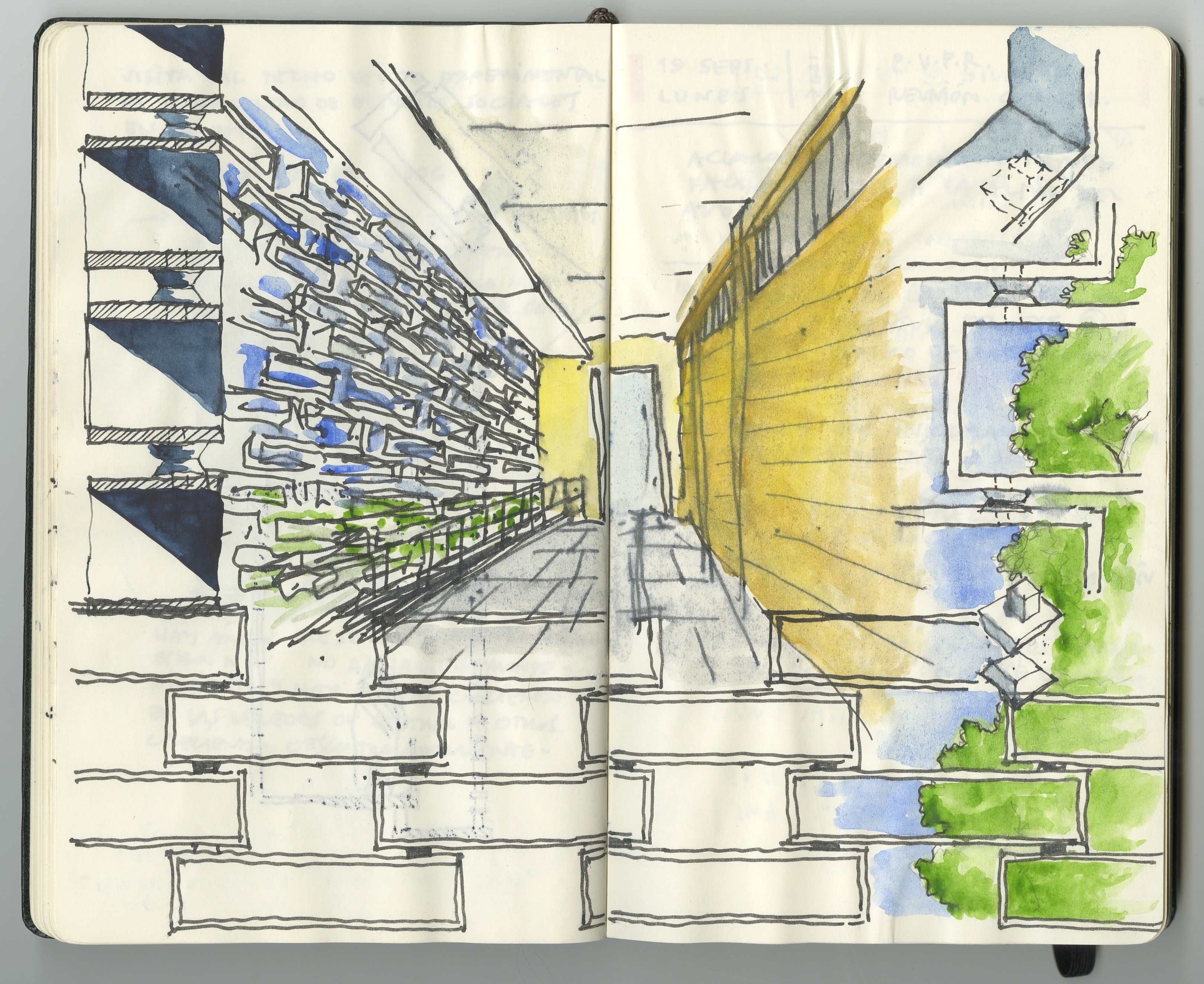 The photographs and sketches above illustrate how the diagonally arranged piers provide a dual spatial experience. On both buildings, while attending mass (looking at the altar) the angled piers become a solid plane that frames our attention towards the liturgical event. In contrast, looking away from the altar the piers become a transparent plane that allows the interior space to extend beyond its built boundaries.
